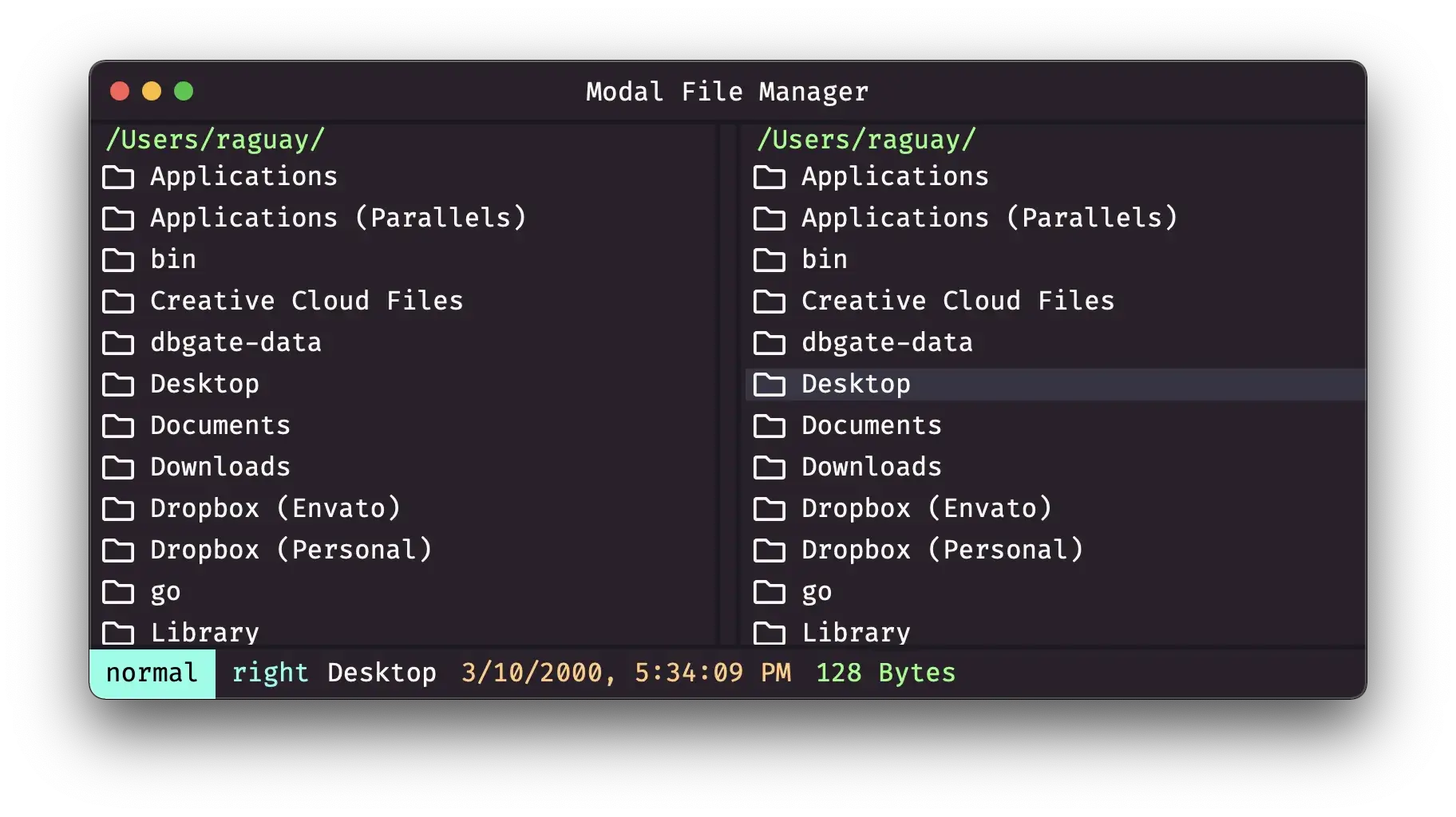 Modal File Manager — это двухпанельный файловый менеджер с использованием веб-технологий. Мой оригинальный дизайн был основан на NW.js, и его можно найти здесь. В этой версии используется тот же код интерфейса Svelte (но с момента выхода из NW.), но бэкенд - это реализация Wails 2. By using this implementation, I no longer use command line rm, cp, etc. commands, but a git install has to be on the system to download themes and extensions. Он полностью закодирован с помощью Go и работает гораздо быстрее, чем предыдущие версии.